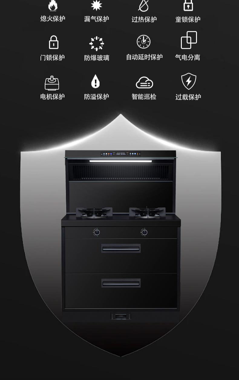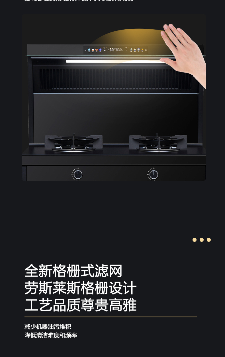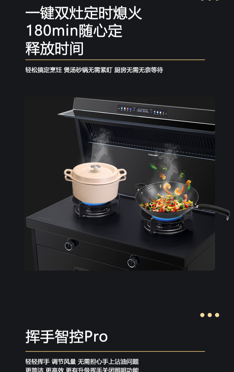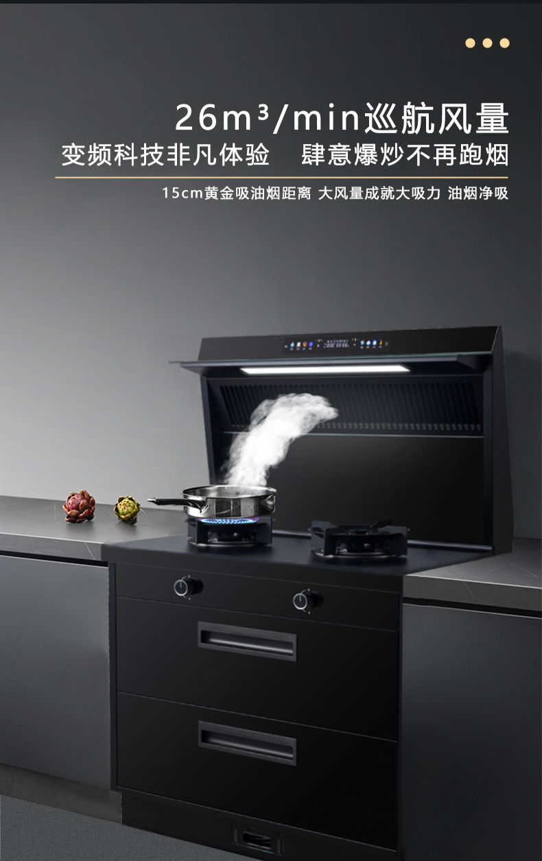 廚房七合一,26方超大巡航風(fēng)量,雙核驅(qū)動(dòng)變頻控制,5kW大火力,揮手智控,電熱自清潔