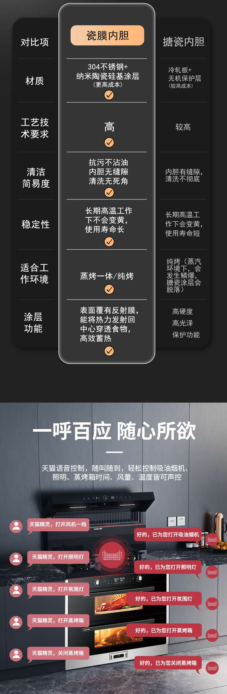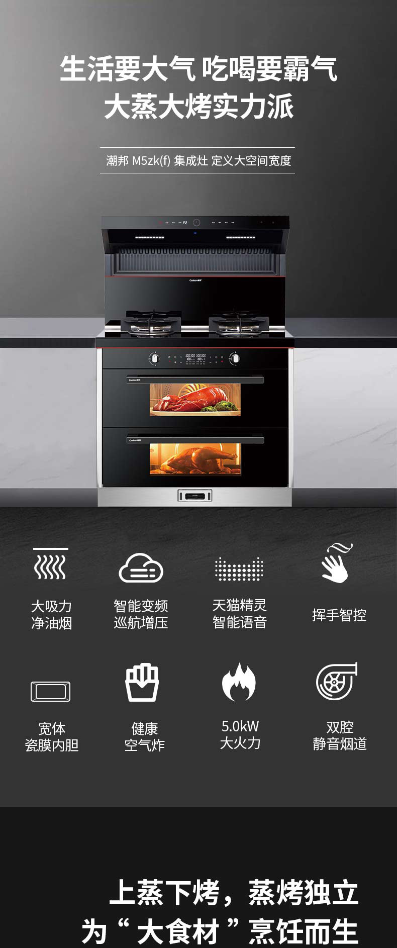上蒸下烤,蒸烤獨立。智能控制,寬體瓷膜內膽。